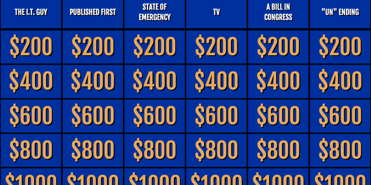 Interactive template will help you create a custom game for your classroom or training meeting. It's free, easy and loads of fun! It mimics the look of the tv show. It's free, fast, and easy. Anyone can create and play a jeopardy game .